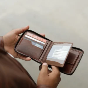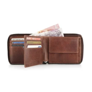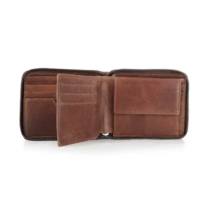 The Magnus men’s leather zip-around wallet is crafted from genuine leather, combining style and security with RFID protection. Featuring a zip-around closure, 7 credit card slots, a buttoned coin pocket, an ID window, slip pocket, and 2 note sections, it’s a practical and elegant everyday accessory.